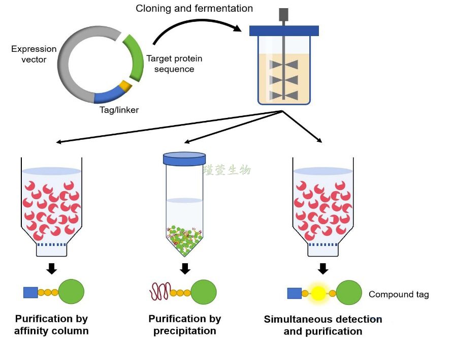 弹性蛋白样多肽(Elastin-like polypeptide, ELP)标签含Val-Pro-Gly-Xaa-Gly重复序列专为无需层析的蛋白纯化设计。融合蛋白可在温和升温或高盐条件下发生可逆沉淀,利用相变温度(Transition temperature, Tt)差异通过选择性沉淀/离心进行纯化。研究表明,其Tt可通过盐或PEG浓度调节,适应4-37.5°C范围。此外,改良型富含组氨酸或多功能ELP标签还能实现pH依赖纯化及特异性检测。另有,Gotzke团队开发了一种一个表位ALFA标签和一个由两种特殊纳米材料构成的ALFA系统。该标签具有亲水性、生理pH中性电荷及稳定α-螺旋结构,可融合于重组蛋白任意端或结构域间。
